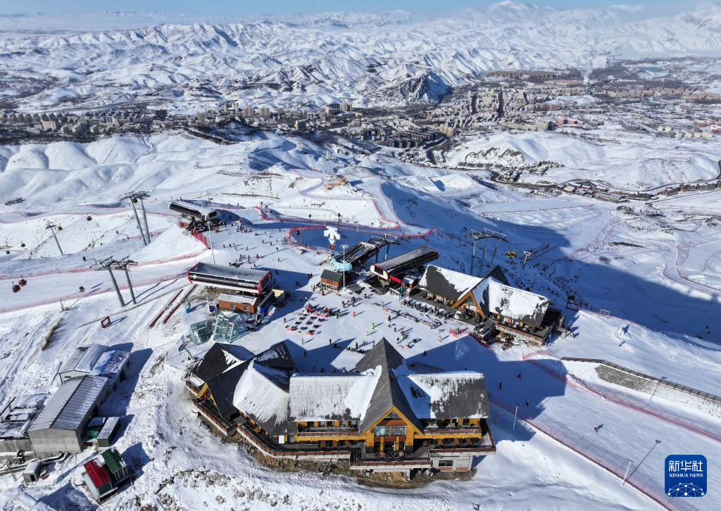这是1月24日拍摄的将军山国际滑雪度假区山顶区域与阿勒泰市城区风貌(无人机照片)。