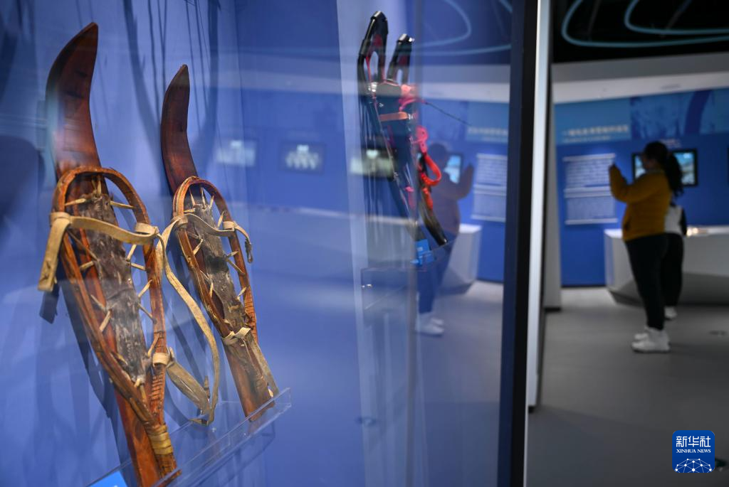 1月24日,游客在位于将军山国际滑雪度假区的阿勒泰人类滑雪起源地博物馆参观。