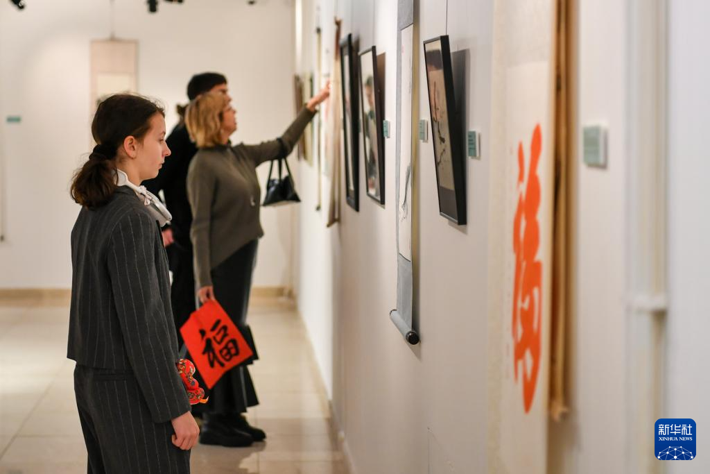 1月25日,人们在俄罗斯莫斯科中国文化中心欣赏书画作品。