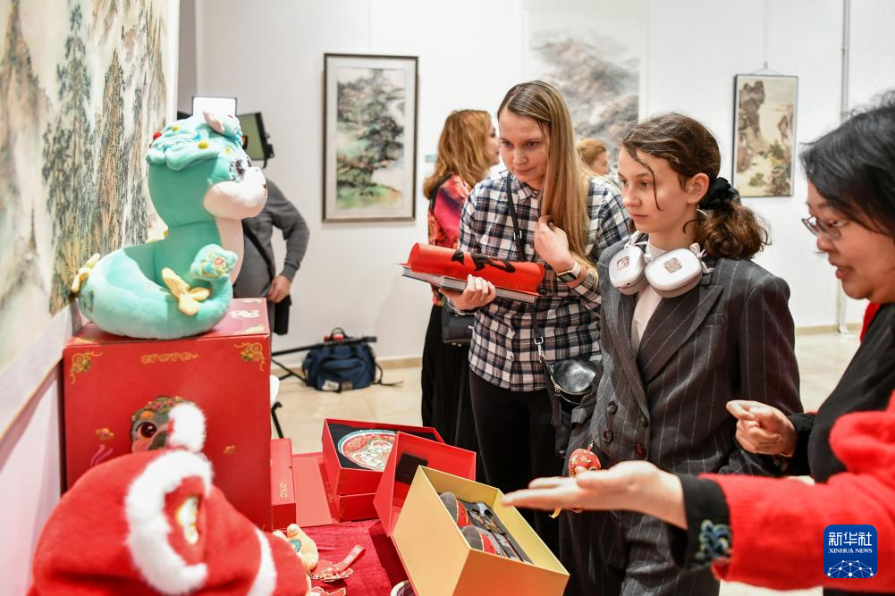 1月25日,人们在俄罗斯莫斯科中国文化中心观看文创产品。 当日,一场春节文化体验活动在俄罗斯莫斯科中国文化中心举行,吸引了众多参与者。 新华社记者 曹阳 摄