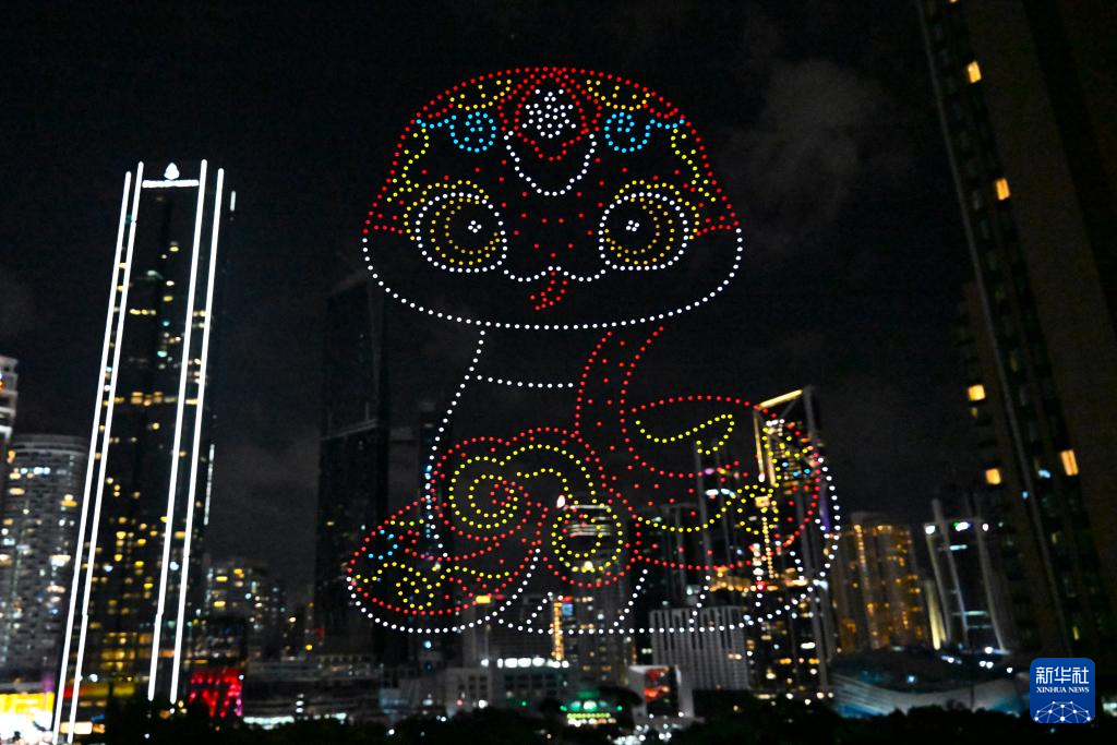 1月25日,在马来西亚吉隆坡举行的2025年“欢乐春节”全球启动仪式前,无人机展示蛇年主题图案。