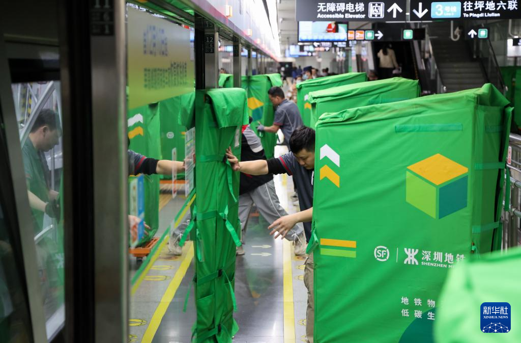 每天晚上,赵琼和同事们将快件安检、打包、分拣,再装入笼车。快件经由一段无人接驳车的运送,最终被搬运至地铁车厢。在不影响乘客出行、保障公共安全的前提下,地铁11号线的第六节车厢在平峰时间被划分为物流车厢,用于快件运输。不到半个小时,搭载快件的笼车便可以穿越深圳最繁忙的地段,抵达20多公里外的碧海湾站。