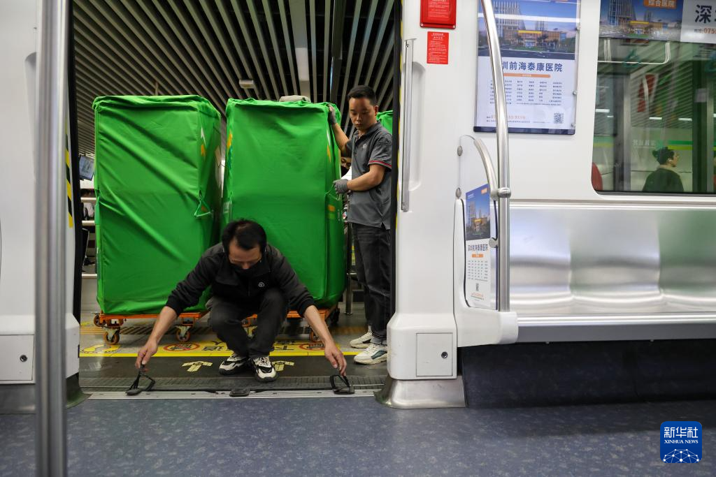 每天晚上,赵琼和同事们将快件安检、打包、分拣,再装入笼车。快件经由一段无人接驳车的运送,最终被搬运至地铁车厢。在不影响乘客出行、保障公共安全的前提下,地铁11号线的第六节车厢在平峰时间被划分为物流车厢,用于快件运输。不到半个小时,搭载快件的笼车便可以穿越深圳最繁忙的地段,抵达20多公里外的碧海湾站。