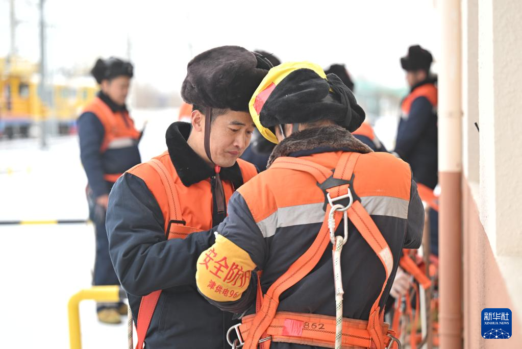 寒潮来袭,中国铁路北京局集团有限公司天津供电段供电维修车间组织应急抢险人员上岗待命,在雪后对铁道上方的接触网运行状态进行巡视,确保春运期间供电设备安全运行。
