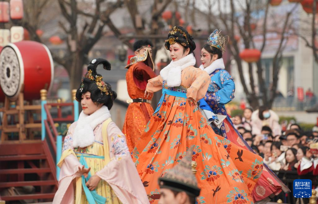 1月31日,游客在陕西西安大唐不夜城景区观看以唐代历史文化为背景创作的舞剧。