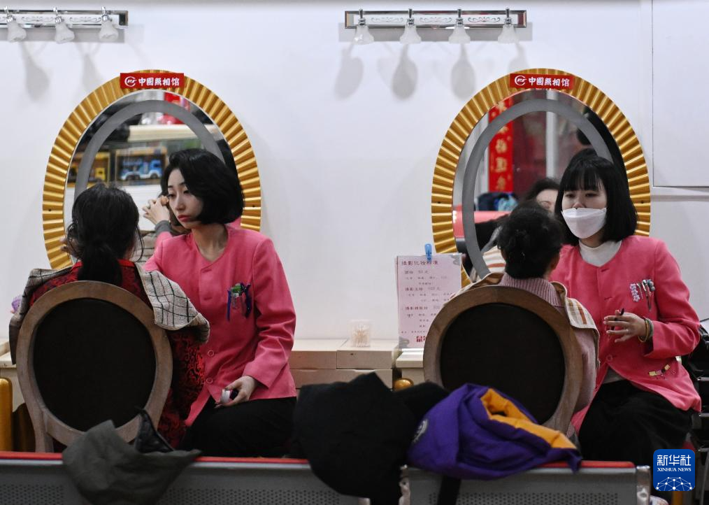2月2日,在北京王府井中国照相馆,化妆师给准备拍照的顾客精心打扮。