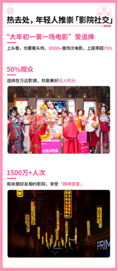 观影需要沉浸感,但银幕之外,年轻人也推崇“影院社交”。今年春节档,50%的万达影城观众,选择结伴而来,享受双人时光。有超过1500万人次的观众,是和亲朋好友一起,在万达影城品尝了“精神家宴”。玩梗、整活也应运而生,“新年的第一场电影”引得Z世代争相打卡:大年初一一早,有超3000场次的放映,上座率超过了70%。