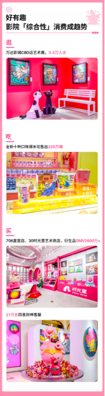 报告显示,在今年,电影院的营收结构,进一步朝着健康、多元化发展。继元旦开业三家“时光里艺术品商店”后,春节期间万达影城内,又有27家艺术商店整齐亮相。它们和706家万达电影直营院线一起,创造了2600余万的衍生品GMV。其中,最炙手可热的文创产品“四喜财神”,用时七天,即宣告21万支全部售罄。