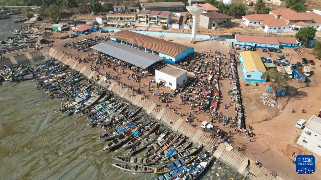 这是2月2日在几内亚比绍首都比绍拍摄的板丁渔业码头的水产市场(无人机照片)。