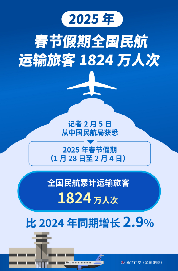 新华社北京2月5日电(记者黄垚)记者5日从中国民航局获悉,2025年春节假期(1月28日至2月4日)全国民航累计运输旅客1824万人次,比2024年同期增长2.9%。