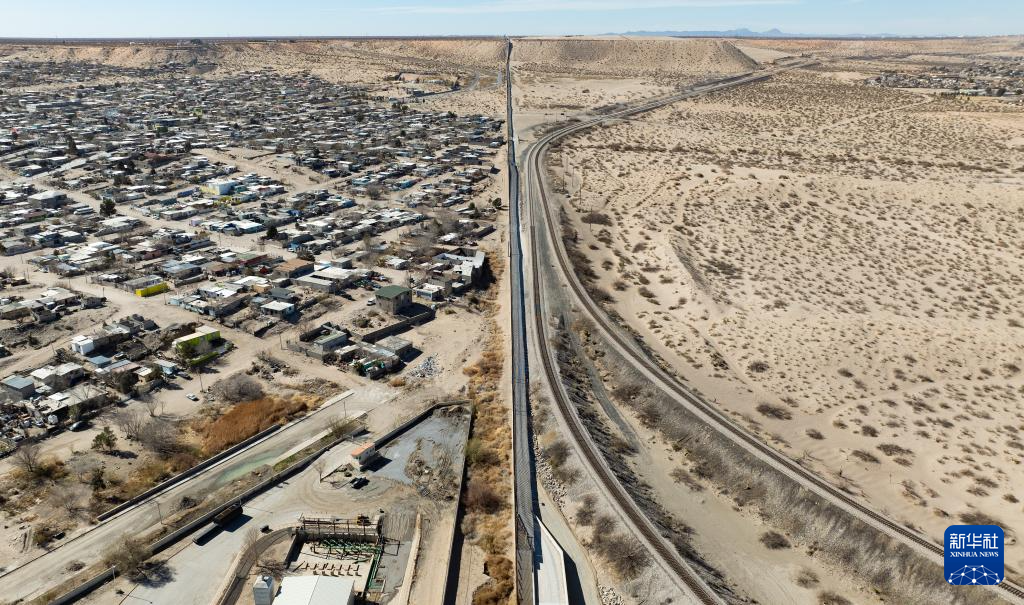这是2月4日在墨西哥奇瓦瓦州华雷斯市航拍的墨美边境墙,墙的左侧是墨西哥。
