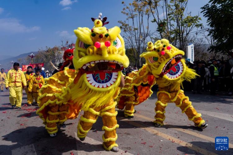 2月6日,人们在南涧县龙灯会上表演舞狮。