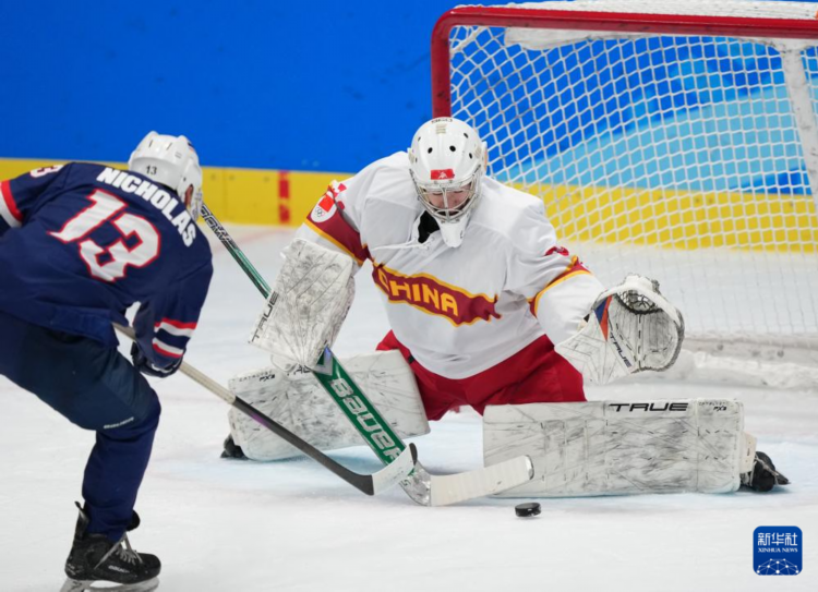 当日,在哈尔滨冰球馆举行的2025年第九届亚冬会男子冰球小组赛A组比赛中,中国队8比0战胜泰国队。