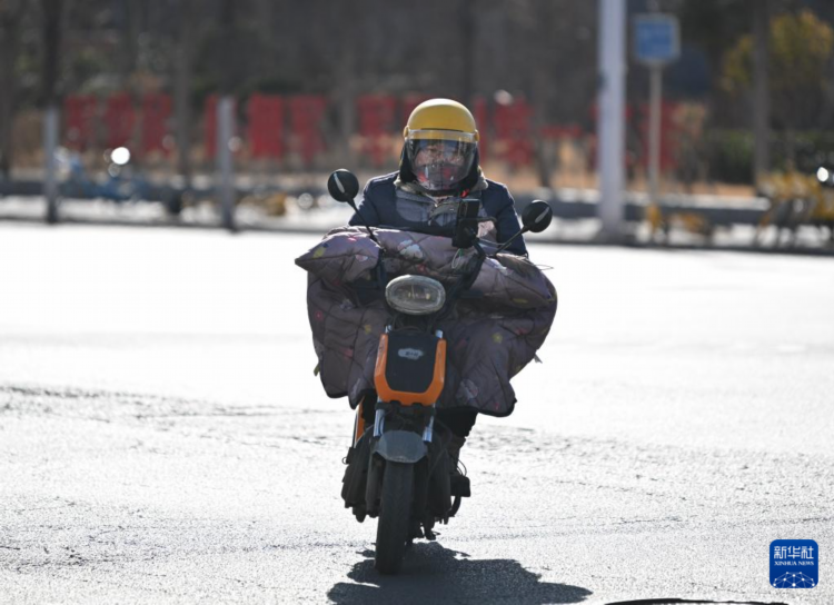 2月7日,在天津市南开区,外卖小哥在大风中送餐。新华社记者 孙凡越 摄