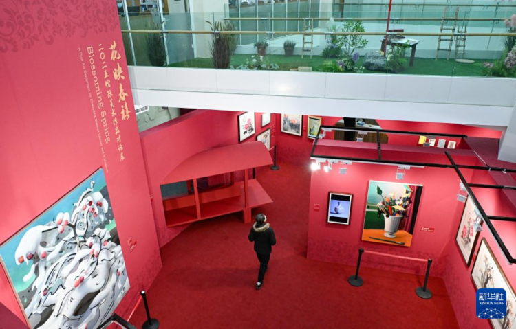 2月9日拍摄的在朝阳区图书馆劲松馆举办的“花映春禧”二〇二五馆际美术作品对话展。