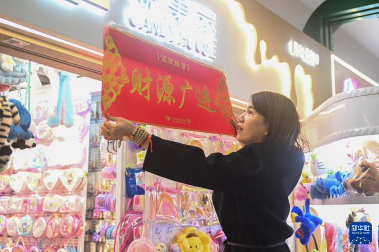 2月9日,义乌国际商贸城的商户在店铺门口张贴领取的新春横幅。
