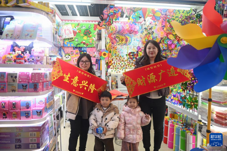 2月9日,义乌国际商贸城的商户在店铺门口展示领取的新春横幅。
