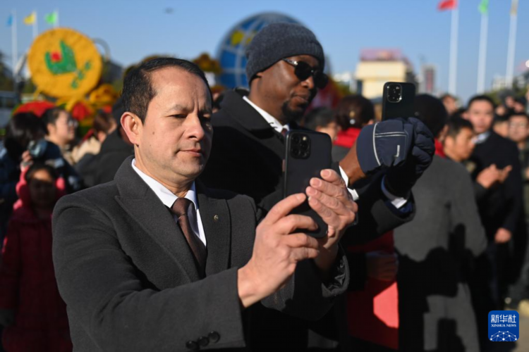 2月9日,来自尼泊尔的客商(左)在义乌国际商贸城观看开市仪式的舞龙表演。
