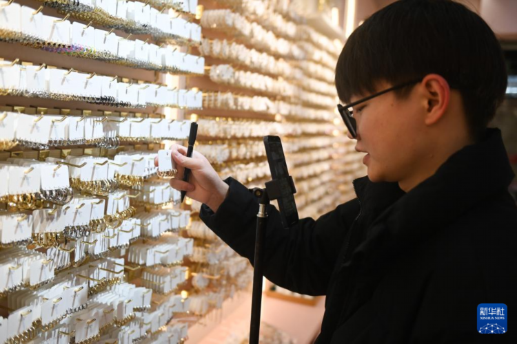 2月9日,义乌国际商贸城的一家饰品店铺工作人员通过手机直播平台销售产品。
