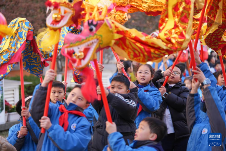 2月9日,在长沙市仰天湖桂花坪小学,小朋友在体验舞龙。