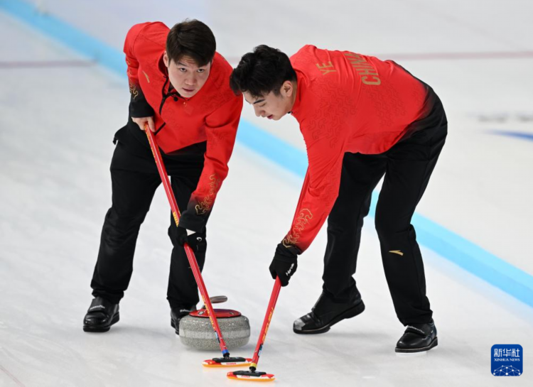 2月9日,中国队选手王智宇(左)和冶建军在比赛中擦冰。