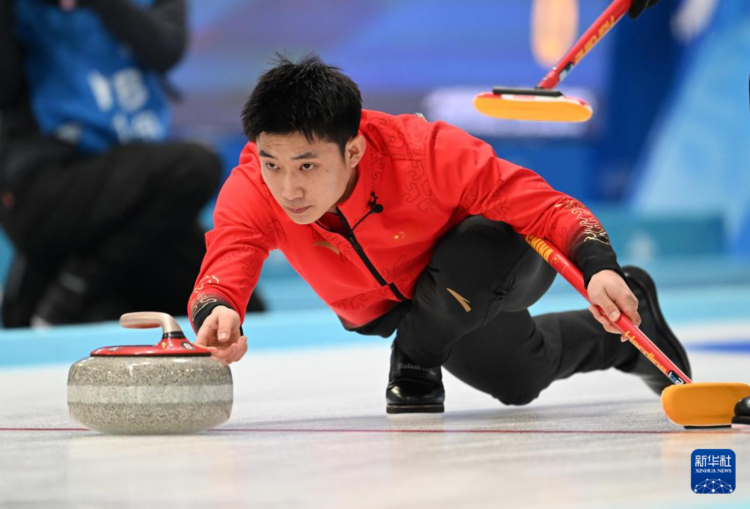 2月9日,中国队选手冶建军在比赛中掷壶。