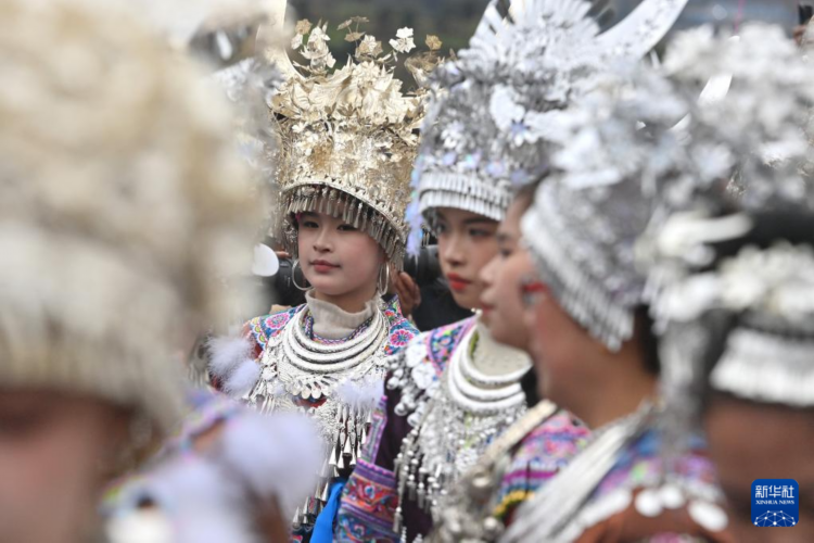 2月10日,在柳州市融水苗族自治县安太乡“十三坡会”,苗族姑娘在跳芦笙踩堂舞。
