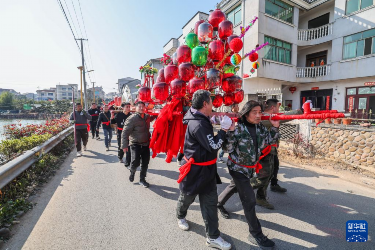 2月10日,赤松镇虎岩村村民抬着板凳龙在村里巡游。