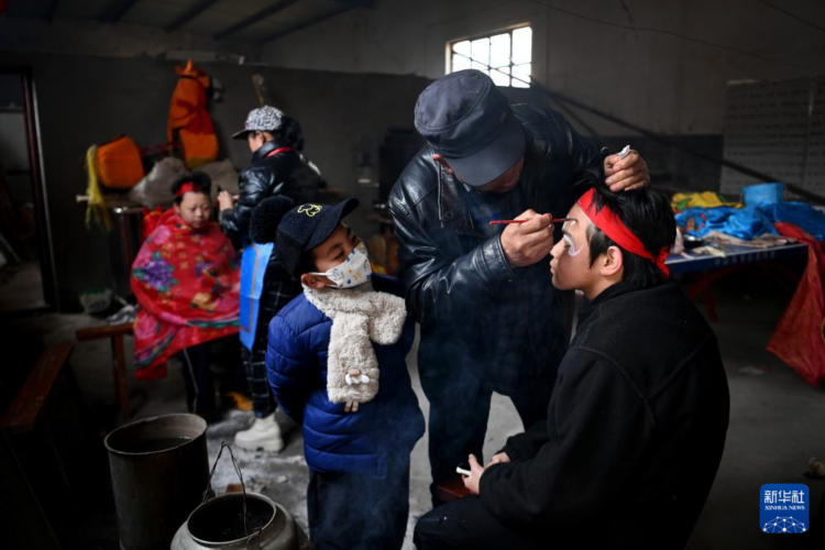 2月9日,陇县曹家湾镇流渠村的村民为社火队的孩子们绘制社火脸谱。