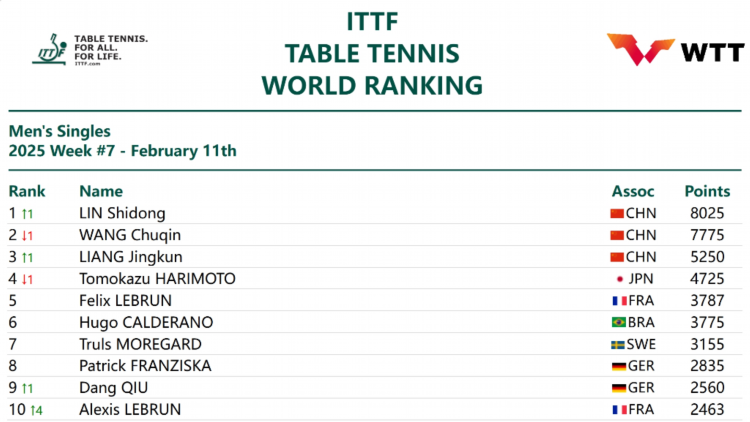 王楚钦与另一位国乒队员梁靖崑分列第二和第三。排名第四至第十的运动员依次为张本智和(日本)、费利克斯·勒布伦(法国)、卡尔德拉诺(巴西)、莫雷高德(瑞典)、弗朗西斯卡(德国)、邱党(德国)、艾利克斯·勒布伦(法国)。