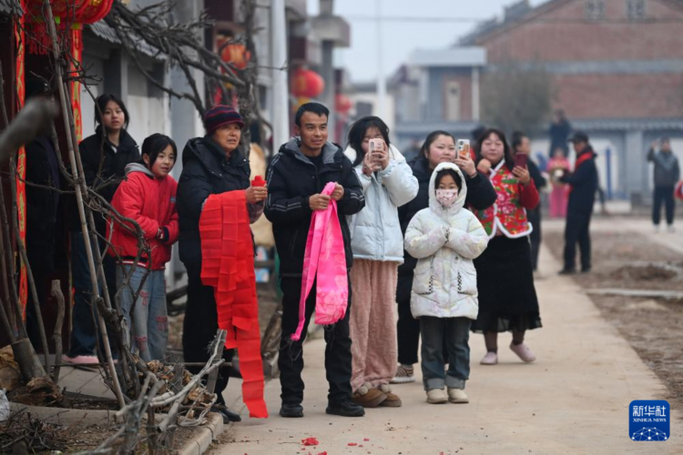 2月11日上午,黄花峪村村民在家门口等待社火队的到来。