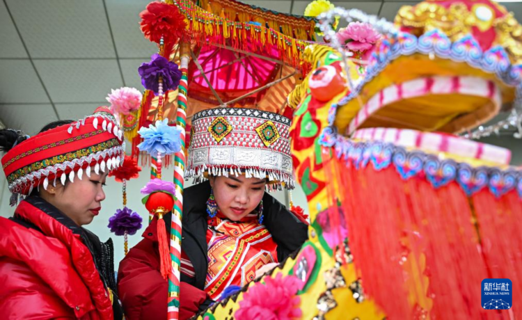 2月6日,在湖北省恩施州利川市柏杨坝镇,灯歌队队员在演出前穿戴衣饰。