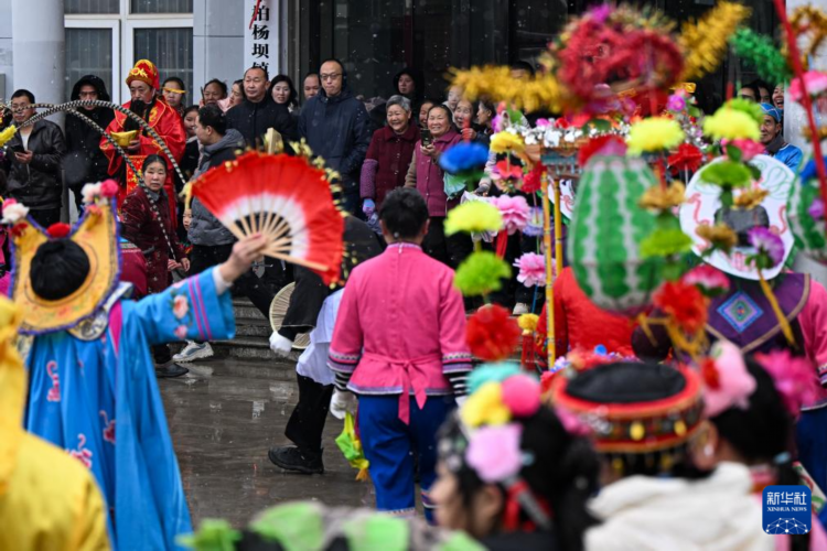 2月6日,在湖北省恩施州利川市柏杨坝镇,人们在观看灯歌表演。
