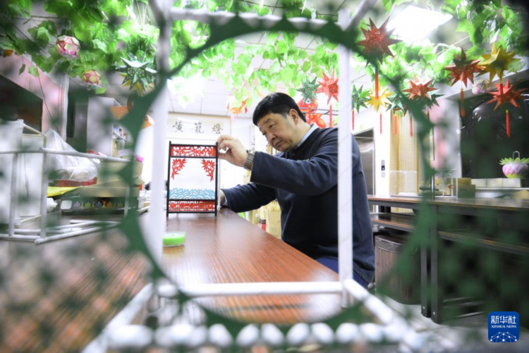 马海捷工作室内挂满了他制作的灯彩(2月10日摄)。