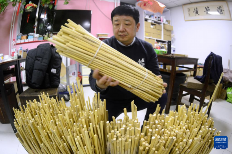 2月10日,马海捷在选择制作灯彩骨架的原材料。
