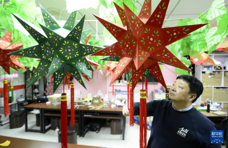 2月10日拍摄的马海捷制作的无骨架技艺蒺藜灯彩。