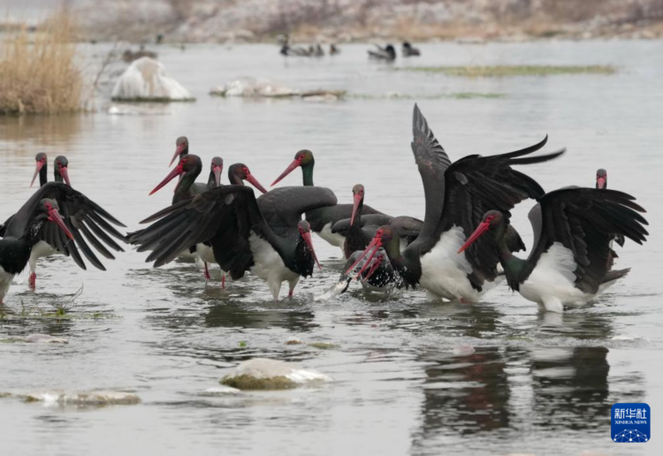 2月11日,一群黑鹳在河北省井陉县境内的绵蔓河内觅食。