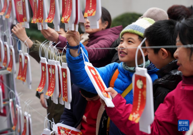 2月11日,在浙江杭州市西湖区北山街道元宵文化庙会活动中,社区居民在猜灯谜。