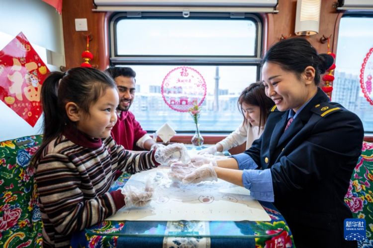 2月11日,沈阳客运段客运一队职工在Z12次列车上和旅客体验制作元宵。