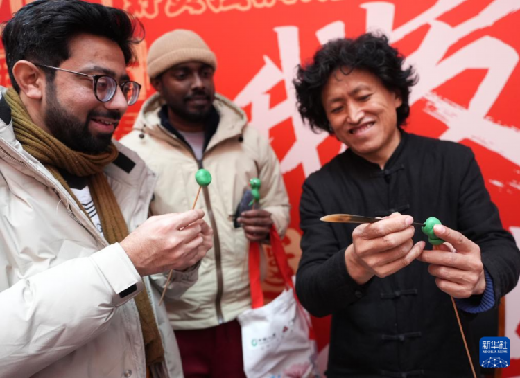 2月11日,在辽宁沈阳马路湾街道,外国朋友获赠糖人礼物。