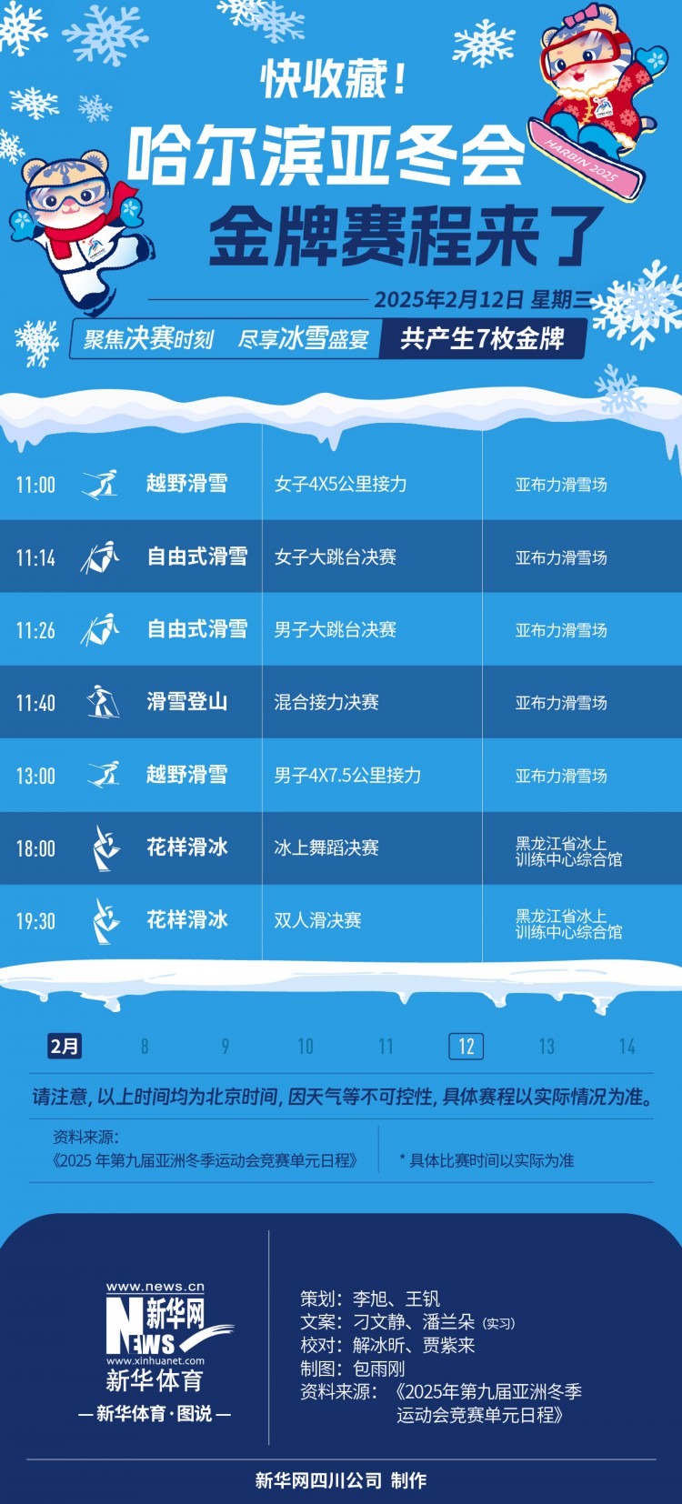 新华社哈尔滨2月11日电(记者王恒志、王君宝)哈尔滨亚冬会12日将决出5枚金牌,新增项目滑雪登山将迎来收官战,中国队将在花样滑冰赛场冲击冰上舞蹈奖牌,此外中国女子冰球队首秀将迎战韩国队。