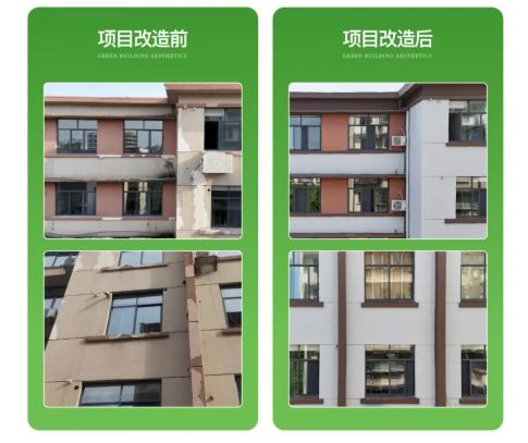 江西省化学工业设计院的办公楼外墙由于长时间的风吹日晒,面临着严重的破损与老化问题。为满足外墙耐久性与美观性的双重需求,该项目在外墙翻新中选用了天彩石水包砂涂料。此涂料通过精细级配砂型的选材,能够精准再现花岗岩的纵深纹理,呈现出宛若天然石材的视觉效果。水包砂涂膜致密稳定,具有出色的耐候性与保色性,抗污染性强,墙面不易挂灰,外墙的美观度和耐用性得到显著提高。