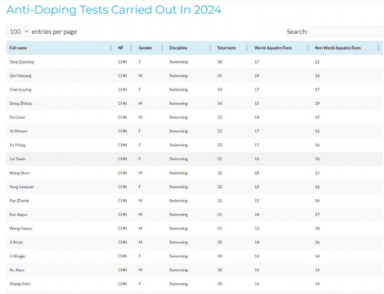 世界泳联2024兴奋剂检测:接受检测最多的前32位全是中国选手