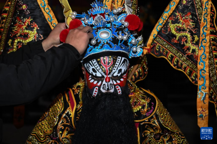 2月11日,在陇县黄花峪村,一名村民为马社火演员穿戴演出服饰。