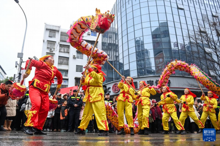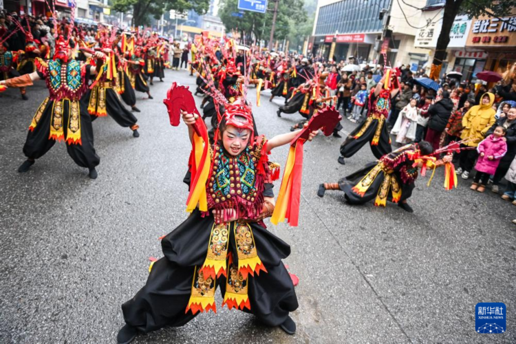 2月12日,在张家界市永定区,当地民间文艺队演员在表演民俗节目。