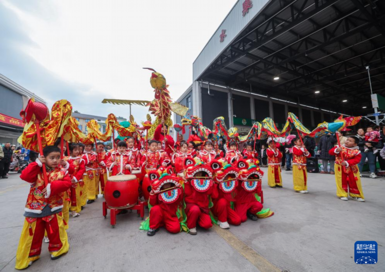 2月12日,在建德市更楼街道的建德新农都农产品批发市场元宵市集上,小朋友表演“萌娃舞龙”。