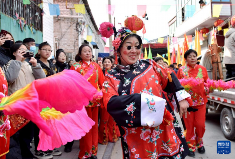 2月12日,民间艺人在河北省邢台市南和区郝桥镇表演扭秧歌。
