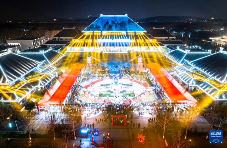 2月12日拍摄的湖北省博物馆“钟鸣楚天元宵夜”灯会活动(无人机照片)。