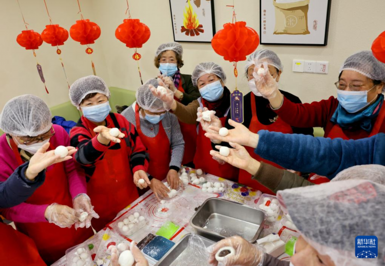 2月12日,社区居民在上海黄浦区老西门街道“厢遇85”社区长者食堂包汤圆。