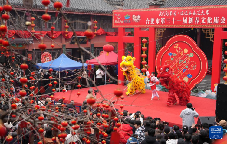 2月12日,在安徽省合肥市城隍庙内,市民在“欢天喜地闹元宵”新春文化庙会上观看《龙腾狮跃闹元宵》舞狮表演。